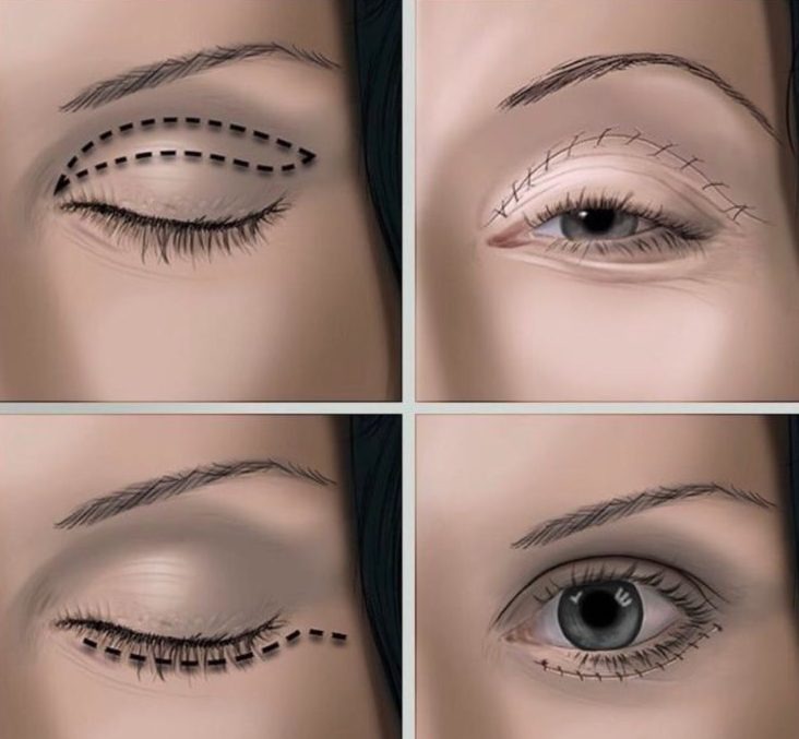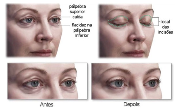 A cirurgia em si: após a infiltração de anestésico local em toda a pálpebra, será realizada a incisão o corte da pele em toda a região demarcada e será feito a retirada do excesso de pele e bolsas de gordura com ou sem o Laser de CO2. Outras técnicas e pontos podem ser associados após esta fase, conforme indicação médica. Finalizado o procedimento, pontos são dados sobre as pálpebras superiores e inferiores (quando há retirada de pele inferiormente). Esses pontos são delicados e podem ser adicionados curativos diretamente sobre os pontos, e/ou gaze sobre a região palpebral.